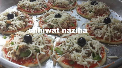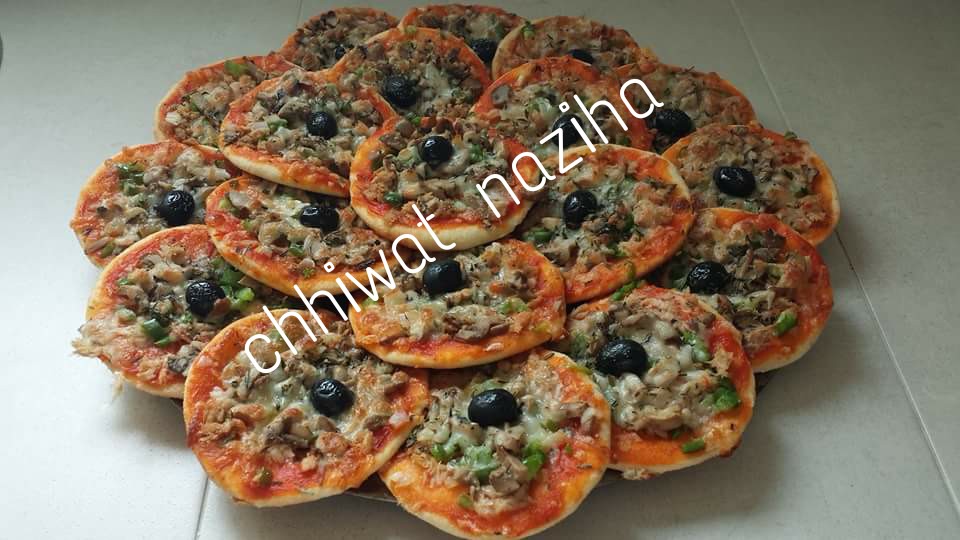 من بعد نقطعوها ونكرصوها ونعمروها على عجين مباشر نعمل مطيشه فريت الزعتر الطون الفلفل والبصل مقطعين صغار والفطر والزيتون والجبن موزاريﻻ وندخلوها للفرن أو بصحة والراحة
