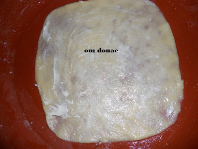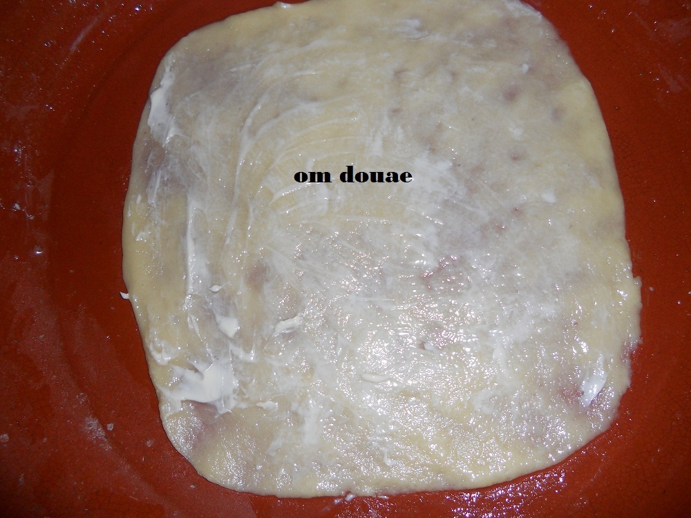 نحطها فطاوة مدهونة بالزبدة و مرشوشة بالطحين نكمل نفس الطريقة لباقي الكرات بغيت نوع ليكم و و ضعت ليكم بعض شكيلات خديت رغيفة طلقتها بنفس طريقة دهنتها بالزيت مع زبدة و رشيت سنيدة