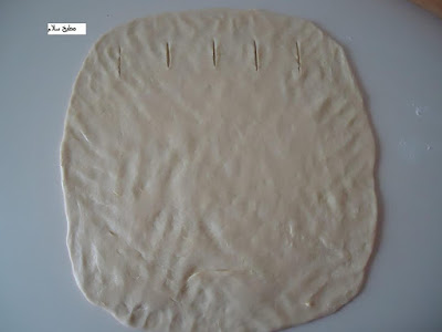 نلف العجين مرتين ونلف الجانب المفتوح من فوق ونجذب الأطراف للتحت لنعمل شكل كوميرة