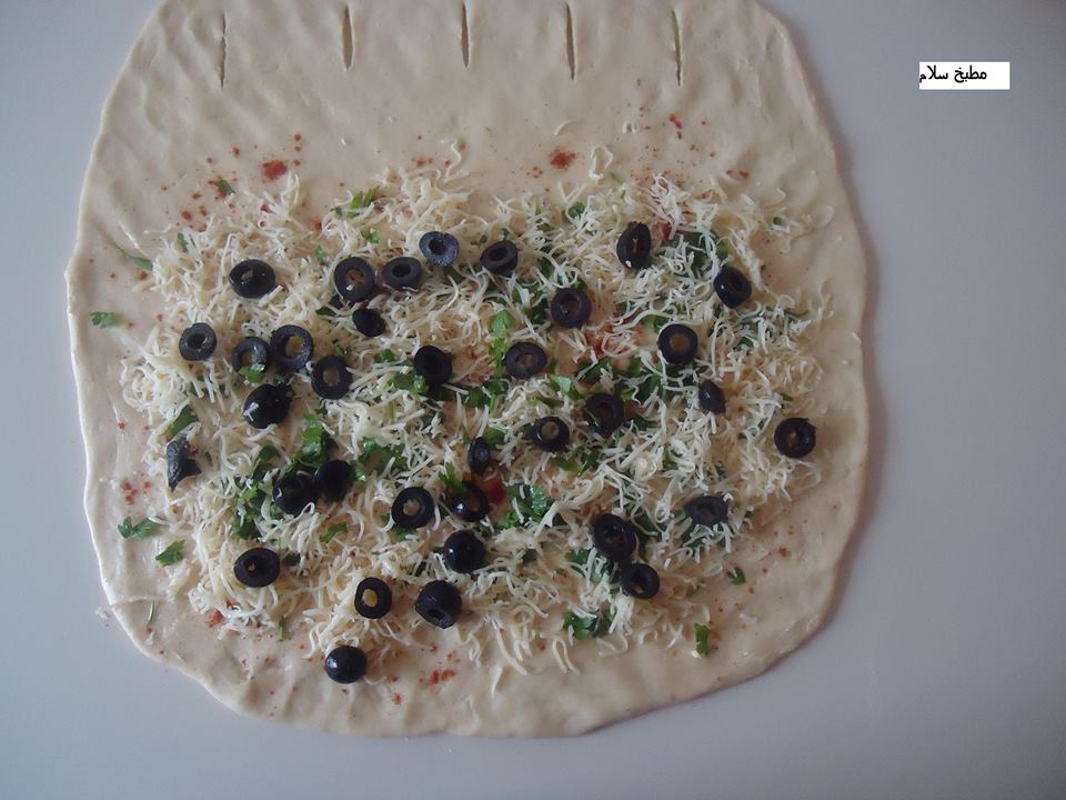 ندهن بالزبدة و نضع فلفل أحمر حار ومعدنوس وجبن وزيتون