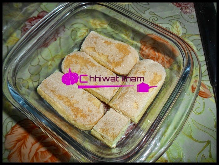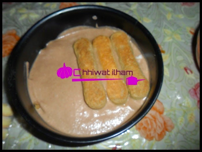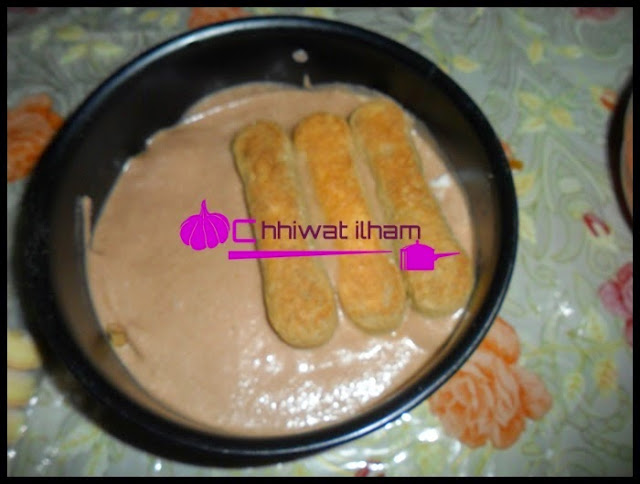 اولا نحاول تقطيع البيسكوي كي يسهل علينا العميلة تم نضعه بالنسكافي تم الى القالب