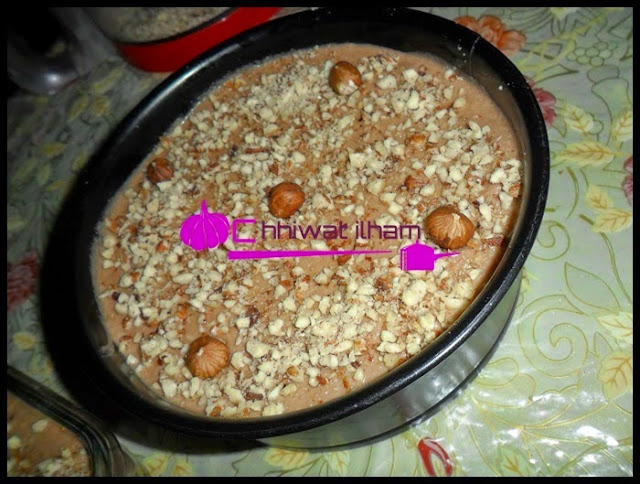 نضع كمية من الكريمة تم البيسكوي تم الكريمة ونزين بالبندق ونضعه بالبراد