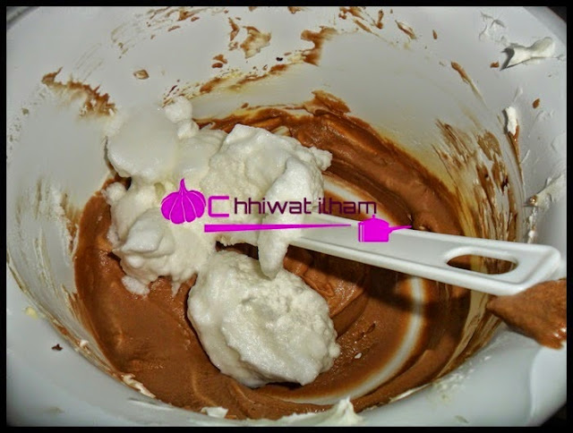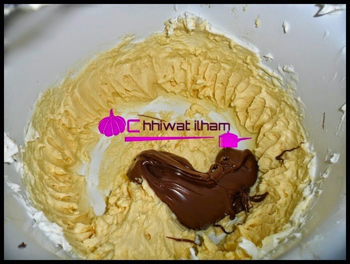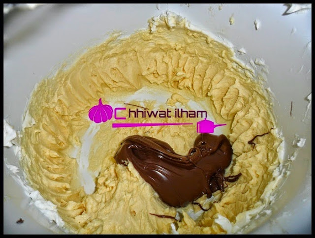 تم نضيف اليه جبنة المسكربون والنوتيلا ونستمر بالخفق