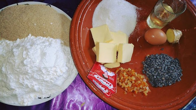 بوضع اولا في القصرية السكر سنيدة والزبدة والبيض ونقوم بخلطهم