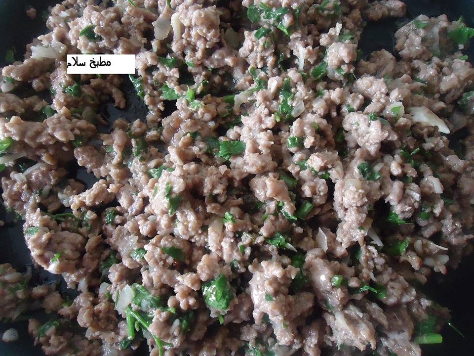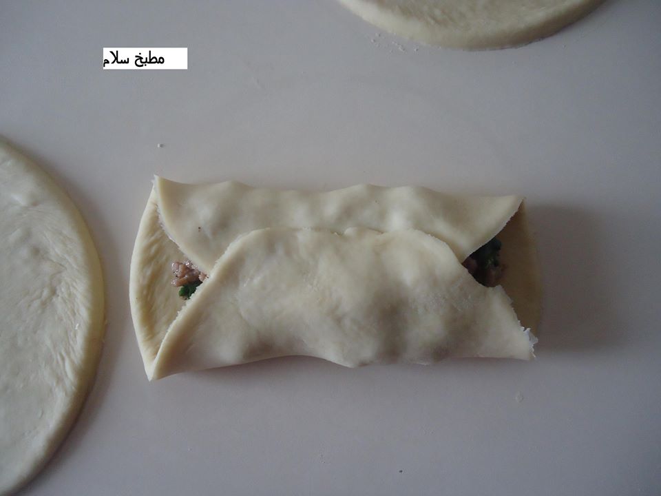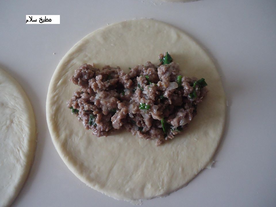 نحط قليل من الحشو فوق كل قرص ( الحشو عملت لحم مفروم مشوح مع بصل ثوم