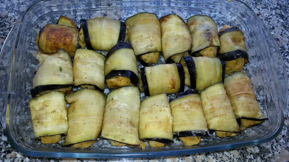 ناخد شريحة البادنجال و نحشوها بخليط البطاطس و نلفه على هدا الشكل