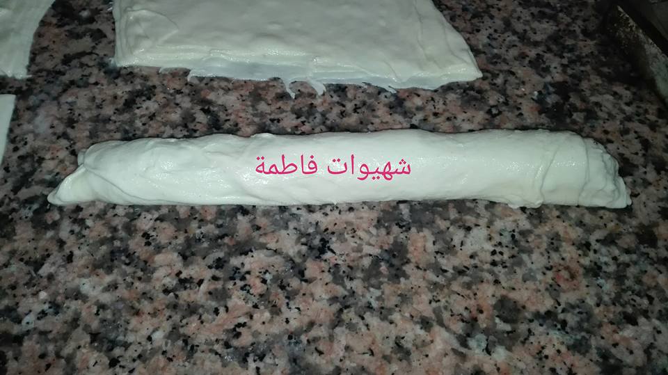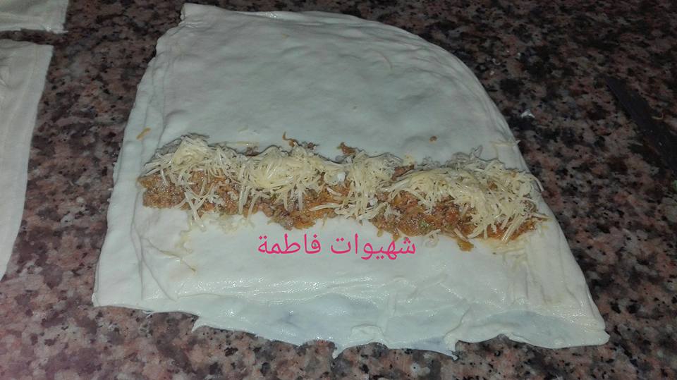 و ناخذ كل جزء و نبسطه قليلا على شكل مستطيل و نضع فيه الحشوة ثم الجبن