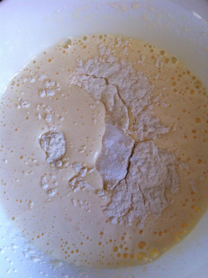 نضيف للخليط وبهدوء 6 ملاعق كبيرة طحين و خميرة الحلوى حتى نحصل على خليط متجانس
