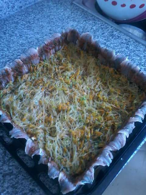 و نحضر الحشوة بحيث نبشر الجزر و القرعة و الفلفل الوان على حسب الموجود و نخلطها مع التوابل و الطماطم المصبرة
