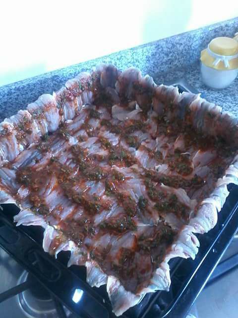ناخد صينية الفرن و نفرش وسطها السردين على الضهر و كدلك على الجوانب كما توضح الصورة