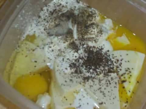 في اناء يمزج الفروماج و البيض و كريم فريش و الملح و الابزار