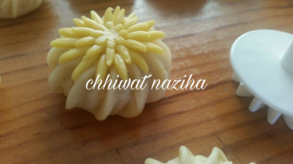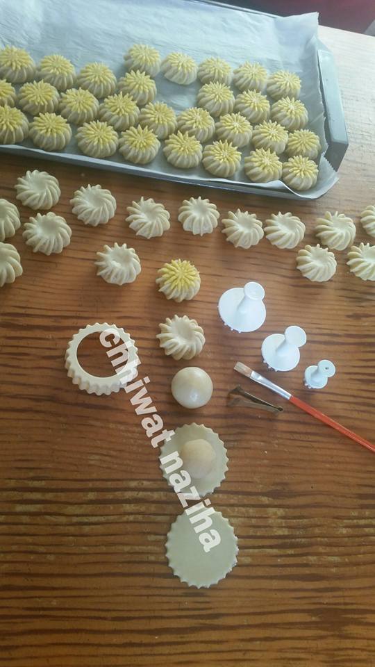 نبسطو العجين و نقطعها بمرشم دائري و نضع العقدة في الوسط ثم نجمعها و نرشمها كما توضح الصورة و نلصق عليها الوريدة الصفراء بابيض البيض و تطهى