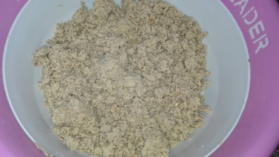 نضيف باقي العناصر تدريجيا و نترك اللوز و السمسم للاخير و الخميرة حتى الغد . يكون شكل الخليط كما في الصورة ثم نضعه في