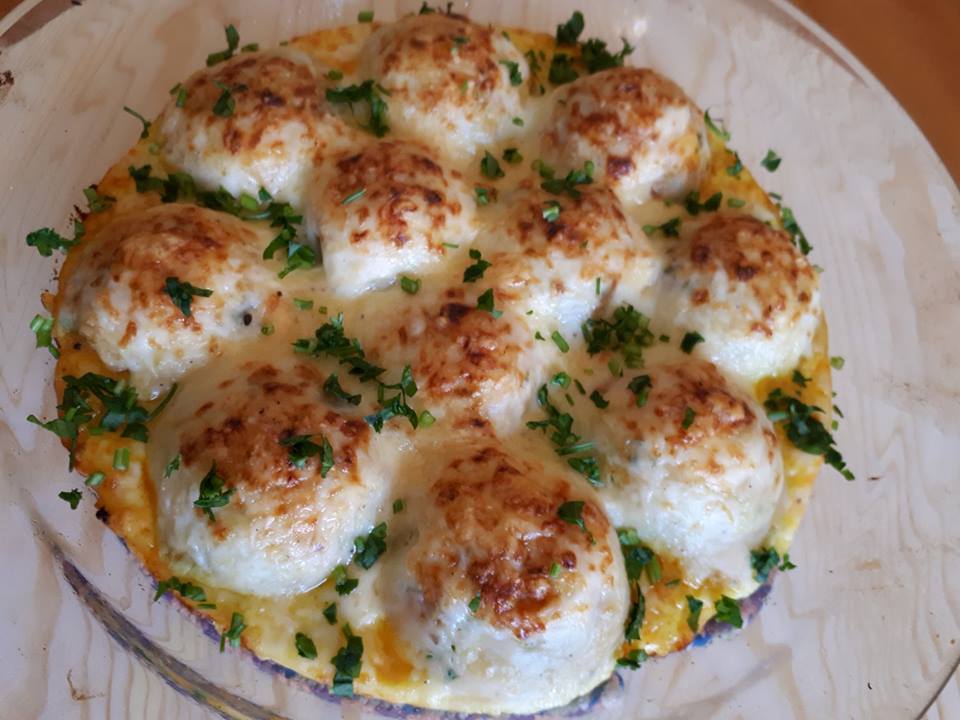 نمزج الخليط جيدا و نعمل كويرات نفتحها في الوسط و نحشيها بلحم مفروم مشحر مع الفلافل و البصل و التوابل وفوق الكفتة نضيف فرماج مثلث و نغلق الكورة و نضعهم جانبا