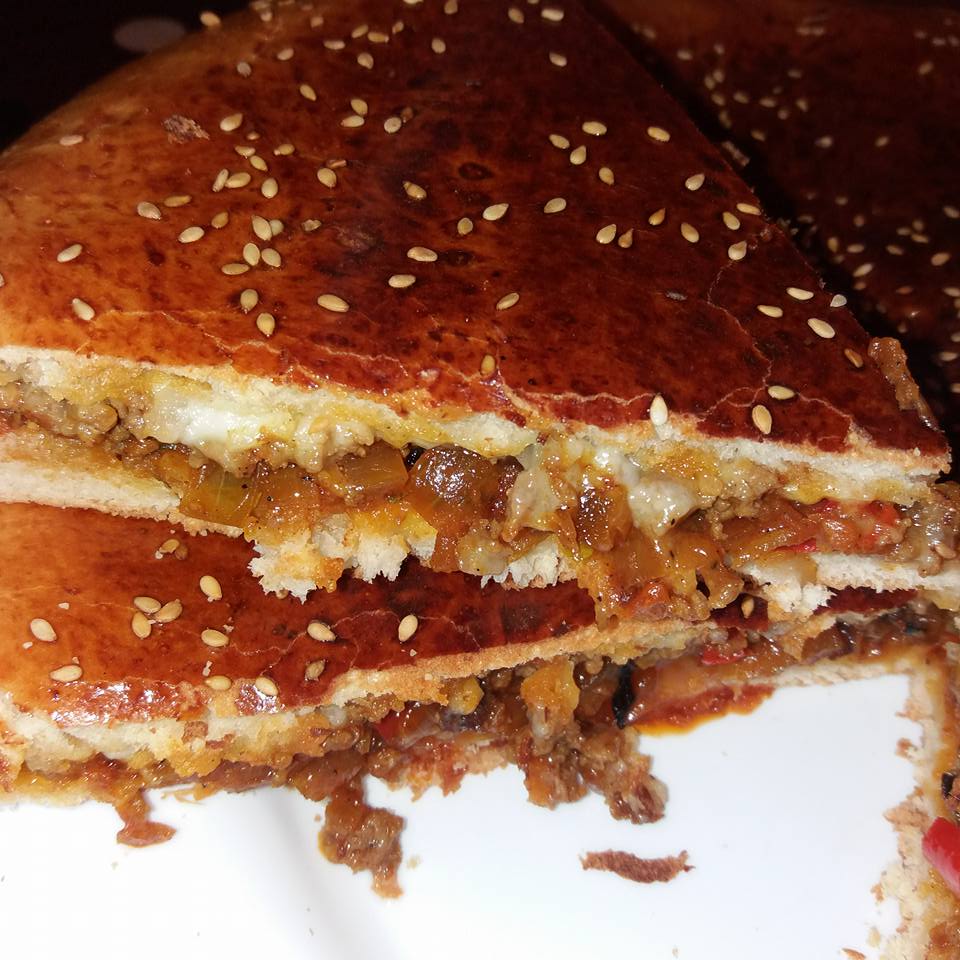 نعجن العجين ونتركها لتختمر و نحضر الحشوة بحيث نشحر جميع العناصر مع التوابل و نتركها تبرد جيدا