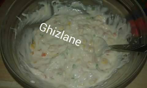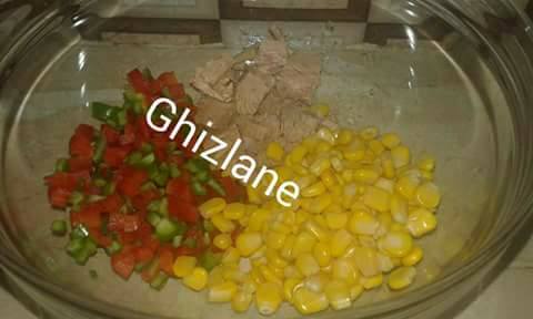نقطع الفلفل الوان قطع رقيقة جدا و نضيف لها الدرة و الطون و صوص البيشاميل و ملح و فلفل اسود