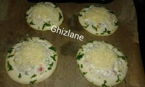 نضعها على صينية الفرن و نملؤها بالحشوة ثم نضع عليها الجبن