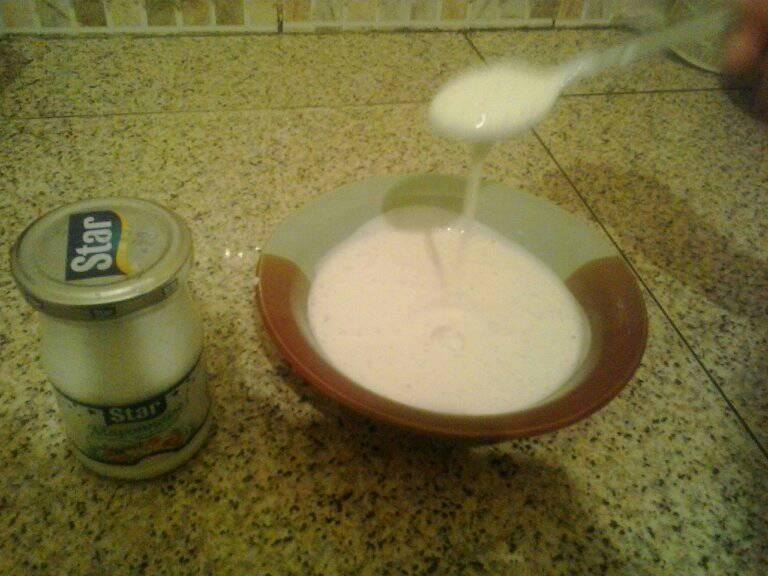 نطرب الحليب و الفرماجة و الملح و الخل و الابزار جيدا و نضيف الزيت تدريجيا حتى الحصول على القوام المراد