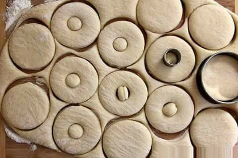يمدد العجين بعد ذلك على سطح مرشوش بالدقيق و تقطع دوائر متساوية أو حسب الرغبة