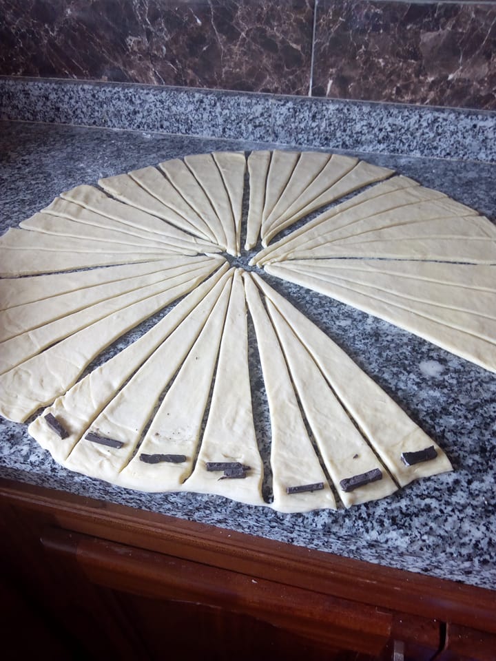 ونطلقها بالدلاك و تكون كبيرة نقطعها بالجرارة كما توضح الصور ونضع الشكلاط في الاطراف ونلف