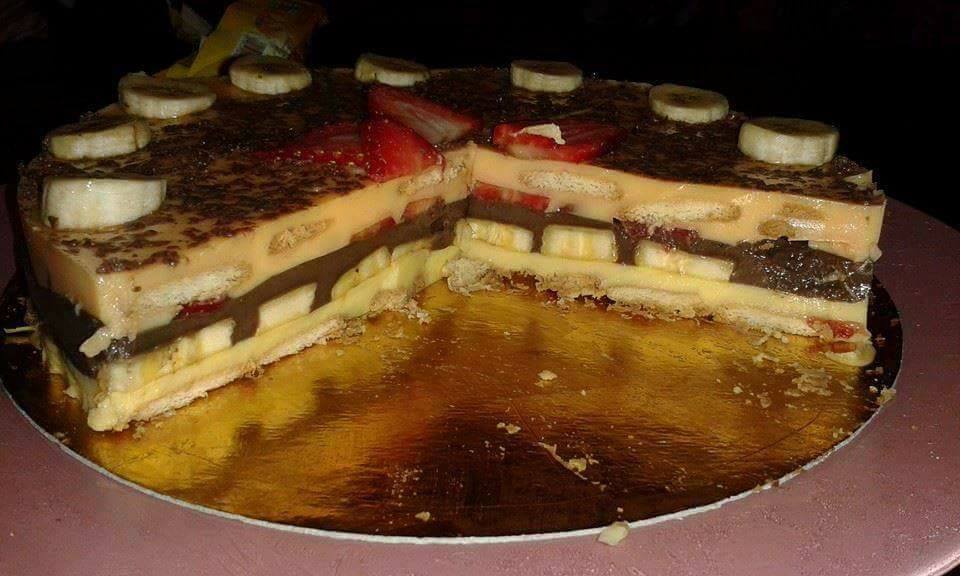 الكل فوق النار حتى يعقاد و نصبه فوق البنان و نفرش طبقة جديدة من البسكويت ثم قطع من الفريز او اي فاكهة اخرى