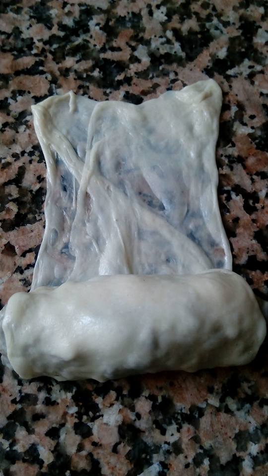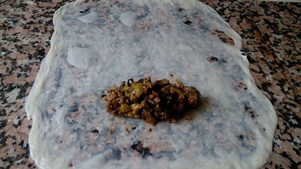 تبسط كورة العجين جيدا و نضع الحشوة في الجانب