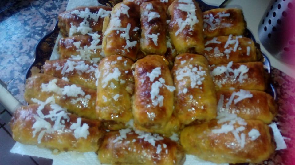 على حسب الرغبة هنا استعملنا بصلة مقطعة رقيق جدا و شامبنيون و لحم مفروم و توابل و زيتون مقطع و جبن مفروم
