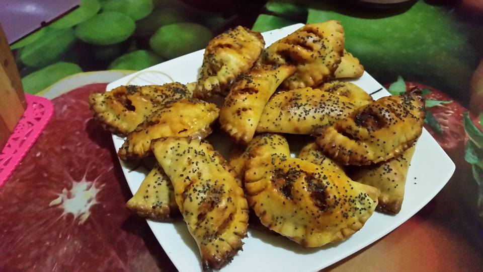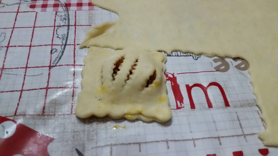 هنا قطعت بمقطع مربع ثم نضع الحشوة في الوسط ونغطي بمربع اخر بعدما نفتحه اربع فتحات