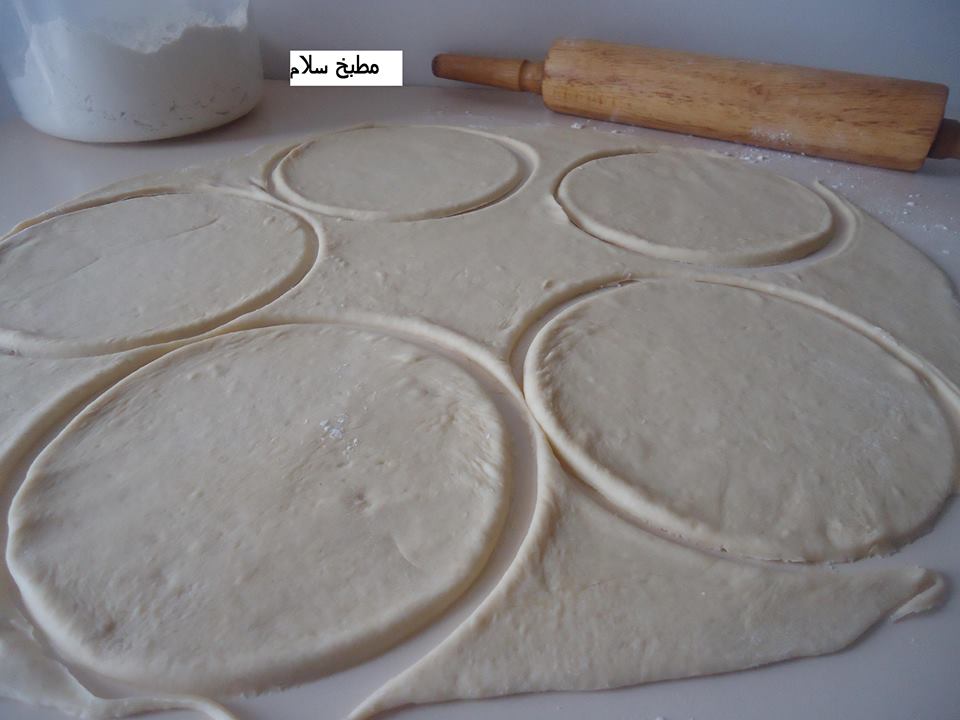 ونقلب الفطائر على الصينية على الوجه الأملس وبالسكين نفتح خط في الوسط دون أن نصل للطرفين