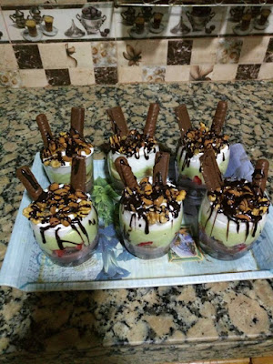 ناخد كؤوس التقديم و نصب اولا الفلون بالكمية المستحبة و على حسب الكؤوس ثم نضعهم في الثلاجة حتى يتماسك