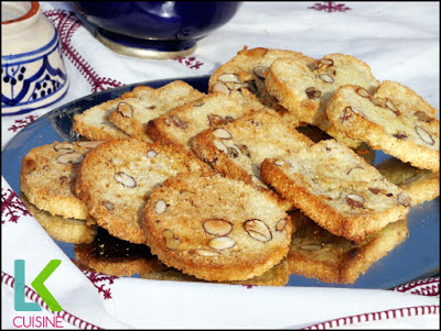نضع اللوز في الماء مدة ربع ساعة على الاقل قبل استعماله في الوصفة ثم نقطره ونجففه ونقطعه