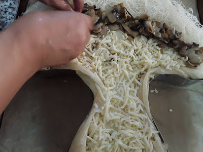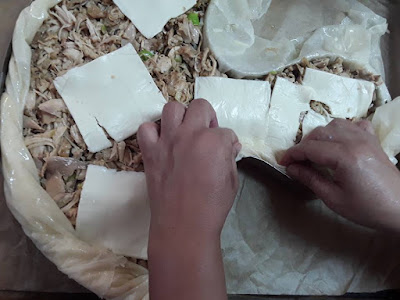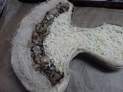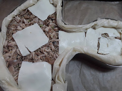 – كمية البورو المتبقية نقطعها رقيقة في مقلة مع القليل من الزيت و الزبدة حتى تدبل نضيف لها كريم فريش القليل من الملح و الدجاج والشومبينيو الطري مقطع شرائح رقاق