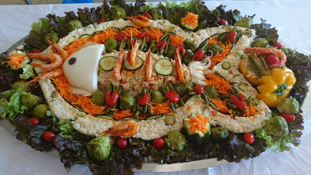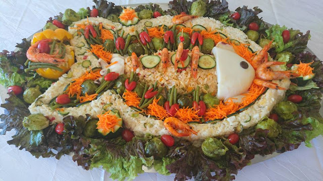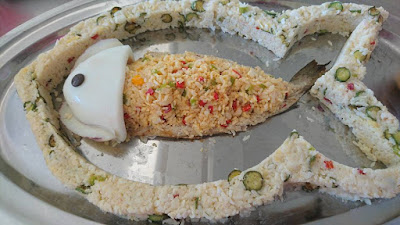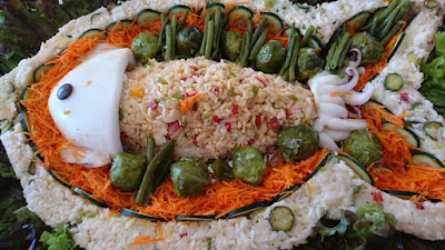 نحتاج لتحضير هذه السلطة الفخمة الى اطار على شكل سمكة في الداخل نضع السمكة و فوقها الارز بالفلفل الوان و الطون طبعا ممكن اضافة اي شيء للارز حسب المتوفر و حسب الرغبة