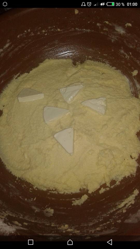 نمزج الزبدة و السكر و الزيت جيدا حتى الحصول على كريمة و نضيف باقي