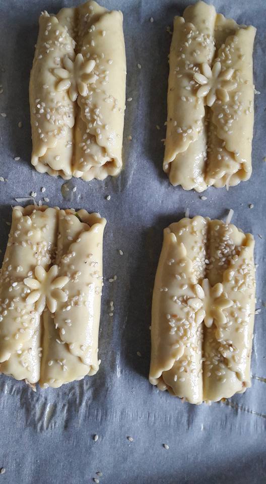 و نزين بوردة من العجين في الوسط ثم ندهن بالبيض ونرش السمسم