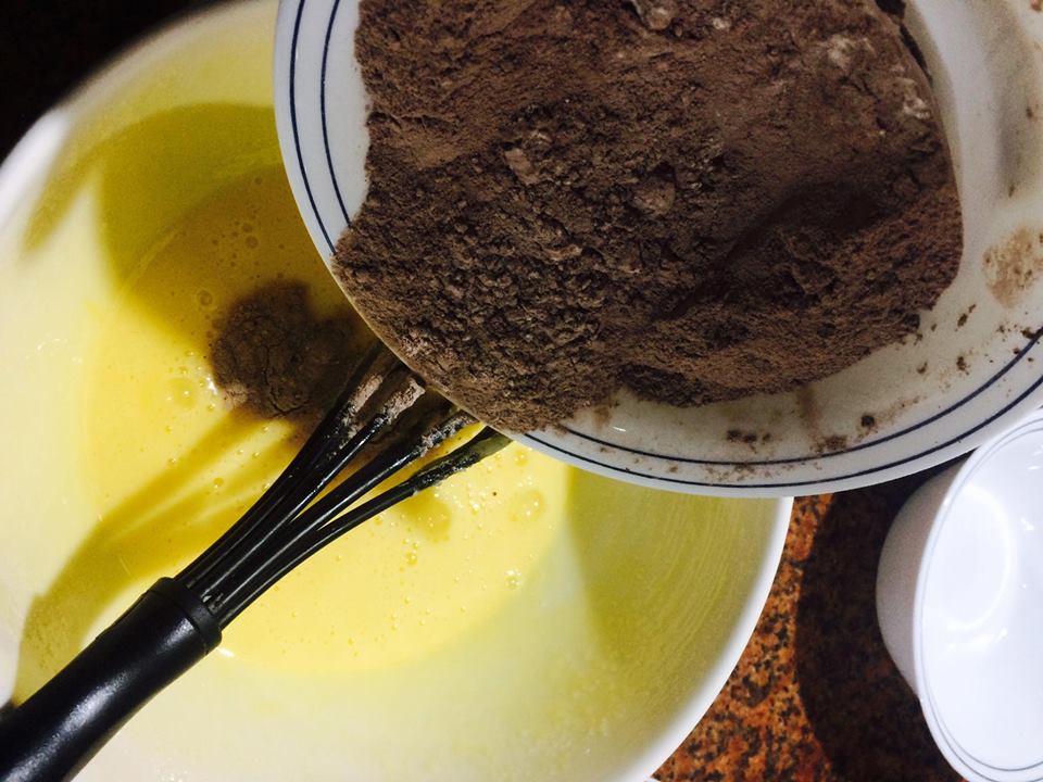 في إناء آخر نمزج 100غ دقيق ممتاز مع 15غ كاكاو خاص بالحلويات و كيس خميرة كميائية