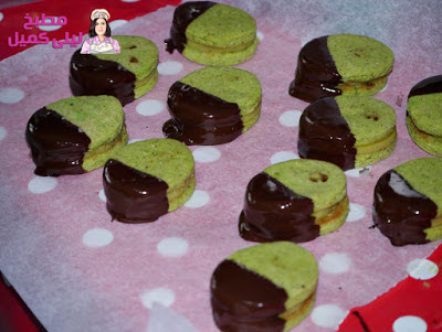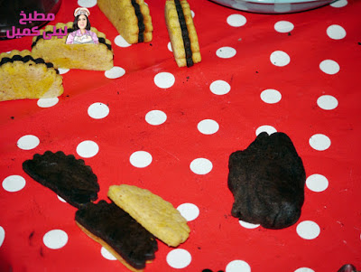 نضيف للعجين الكاكاو والقهوة ونبسطها و نقطعه بطابع على