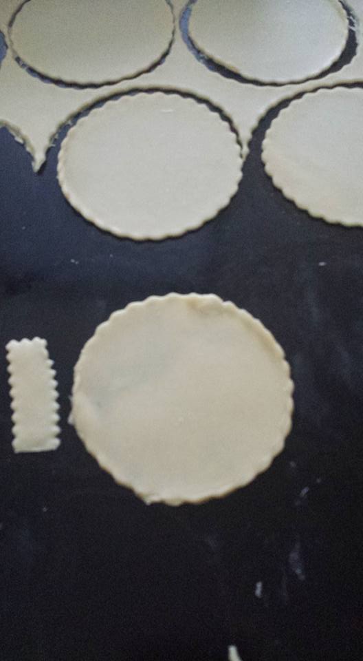 نبسط العجين و نقطعها لدوائر و اشرطة صغيرة كما توضح الصورة