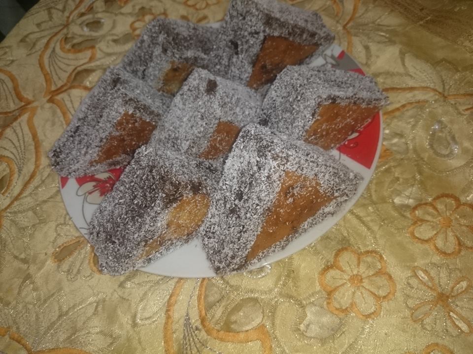 بعد أن يبرد الكيك يقطع إلى مربعات متساوية