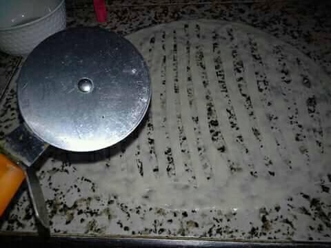 نعمل العجين و نحرك وسط العجين بالفورشيط لكي ينتفخ حتى تتحمر