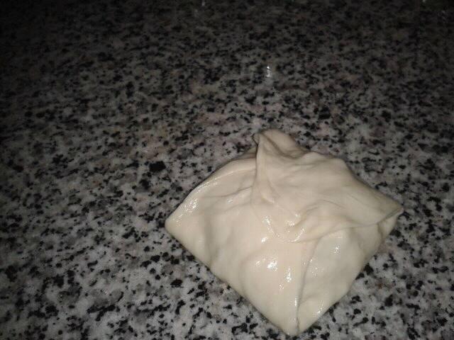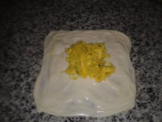 يبسط كل مربع قليلا و يوضع القليل من الحشوة في الوسط