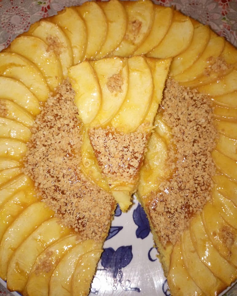 نقشر التفاح و نقطعه الى شرائح و نستفه فوق الكيك فقط الجوانب و الوسط كما توضح الصورة و ندخلها الفرن