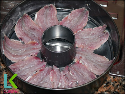 ندهن مول الفرن القابل للفتح بالزبدة ونصفف السردين بشكل متساوي