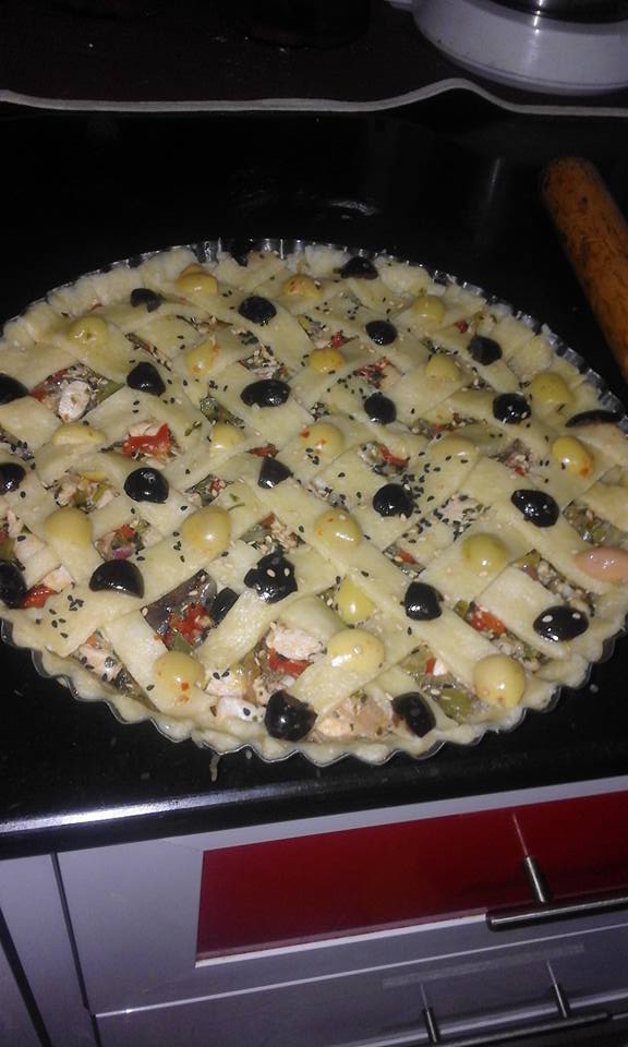 نبسط الكورة الثانية و نقطعها لشرائح و نضعها من فوق كما توضح الصورة و تدهن باصفر البيض تزين بالزيتون