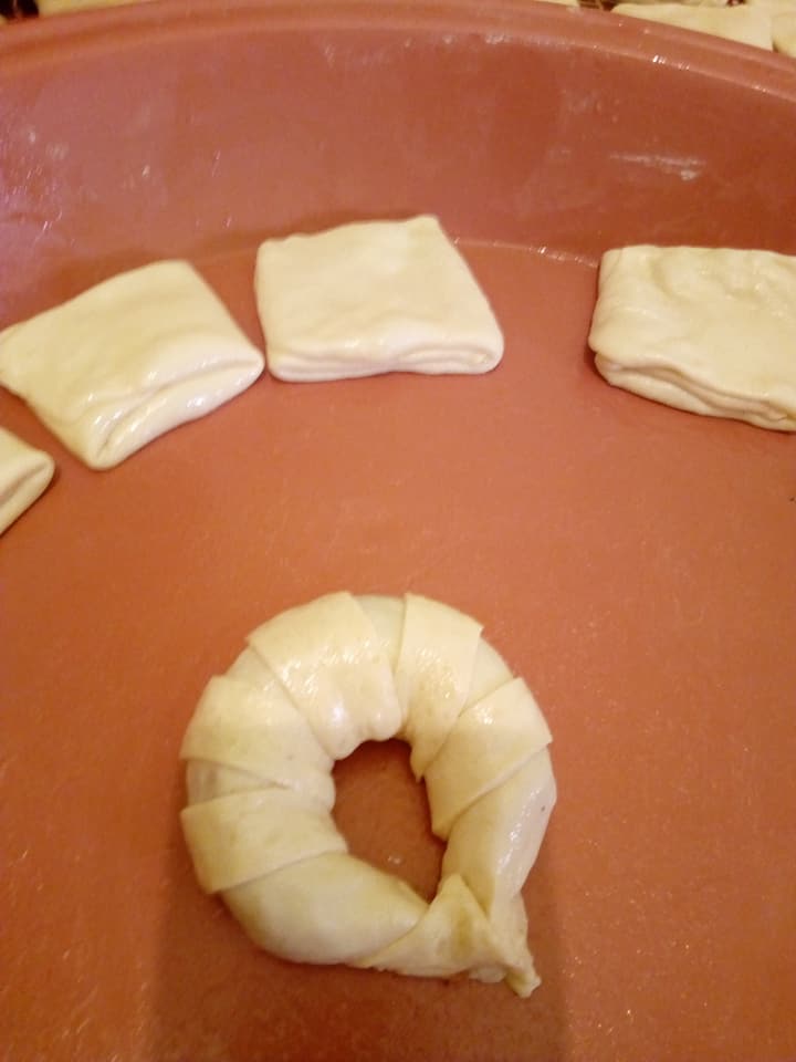 ثم تلف على شكل دائرة و تدهن باصفر البيض و قطرة خل و الى الفرن