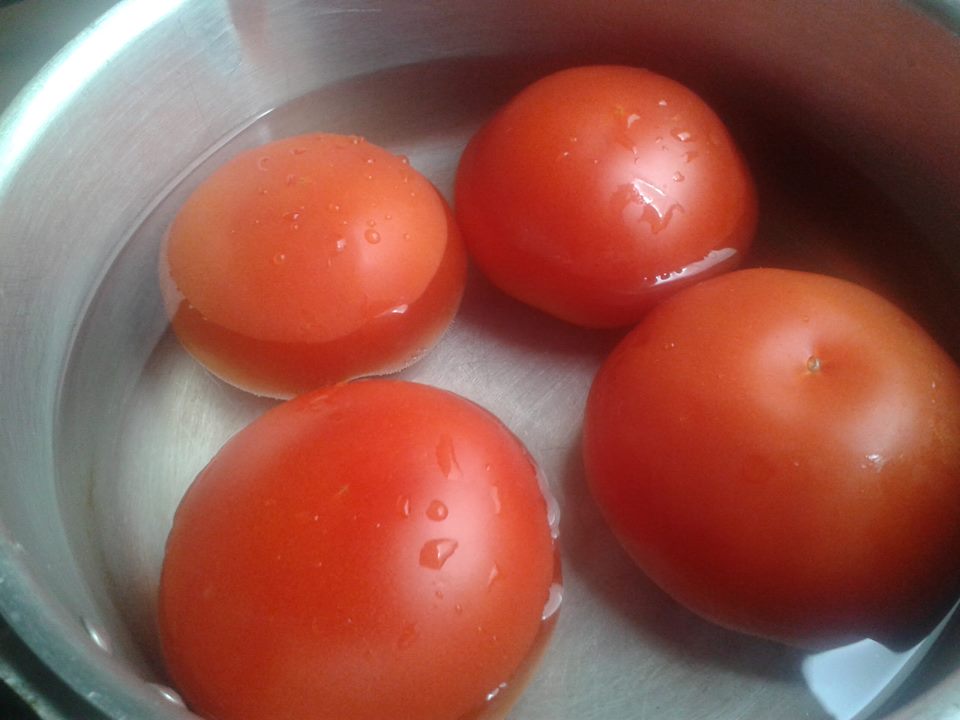 في كسرول نضع الطماطم مع ماء مملح لتغلي غلوتين فقط ليسهل تقشيرها
