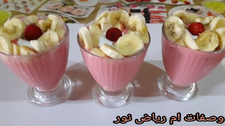 نخرجه من الثلاجة و نضعه في خلاط كهربائي و نضيف له الفاني و الموز و الياغورت و نطحن جيدا