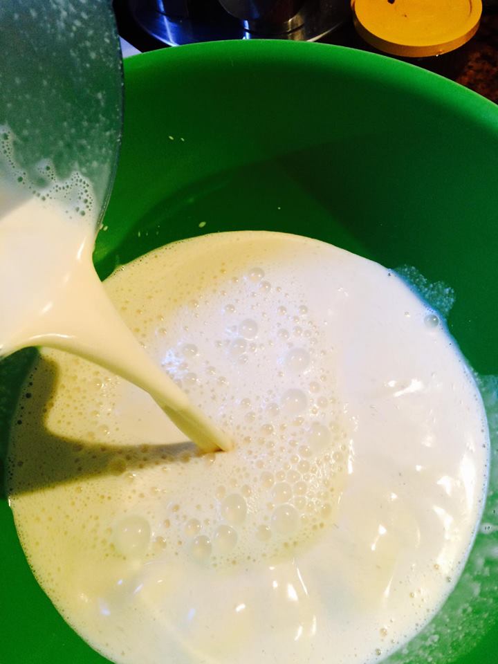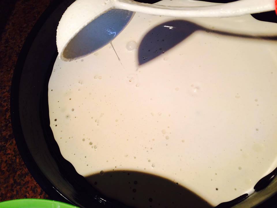 و في صينية الفرن بعد ان تدهن بالزيت نصب فيها الخليط بمغرفة و في كل مرة نملئ فيها المغرفة نحرك الخليط جيدا