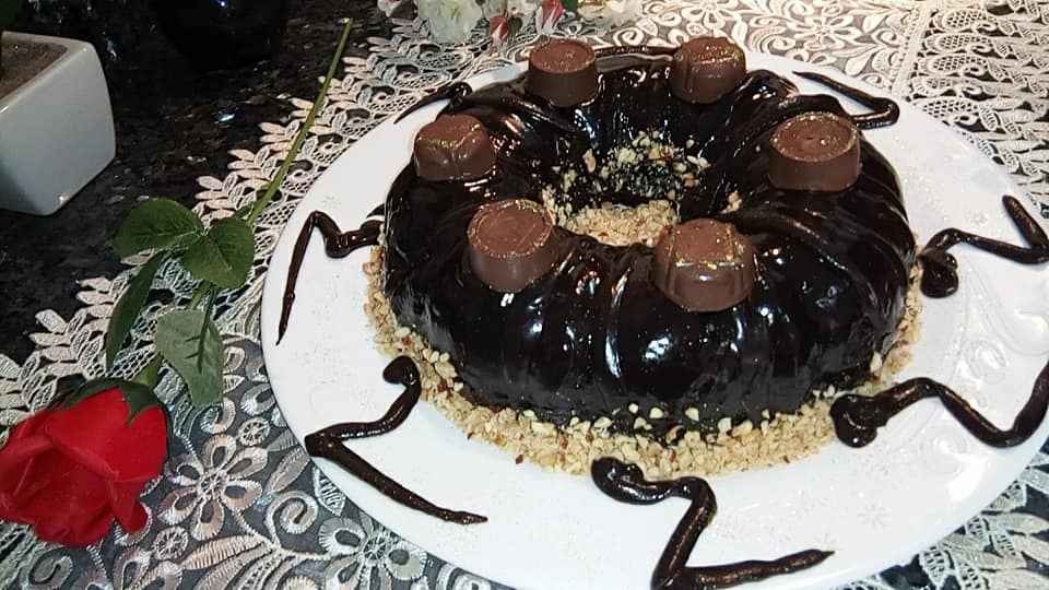 نخرج الكيك من الفرن و نصب عليها الكناش بالتساوي و نزين بالكاوكاو المحمر و المطحون خشن