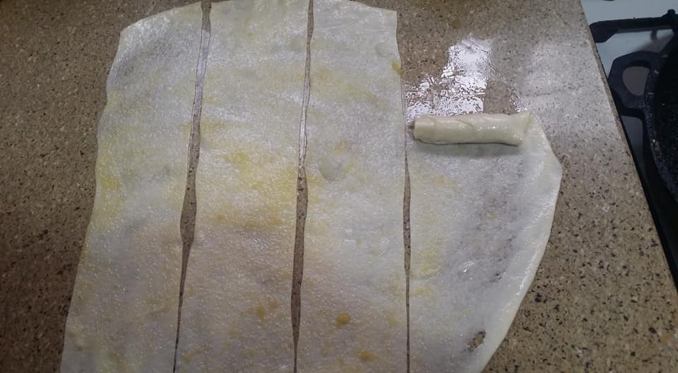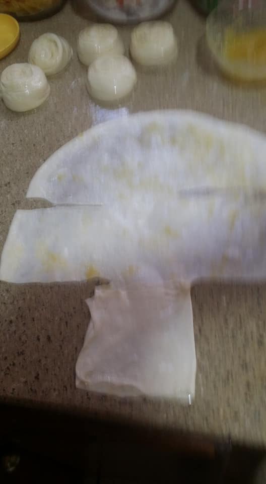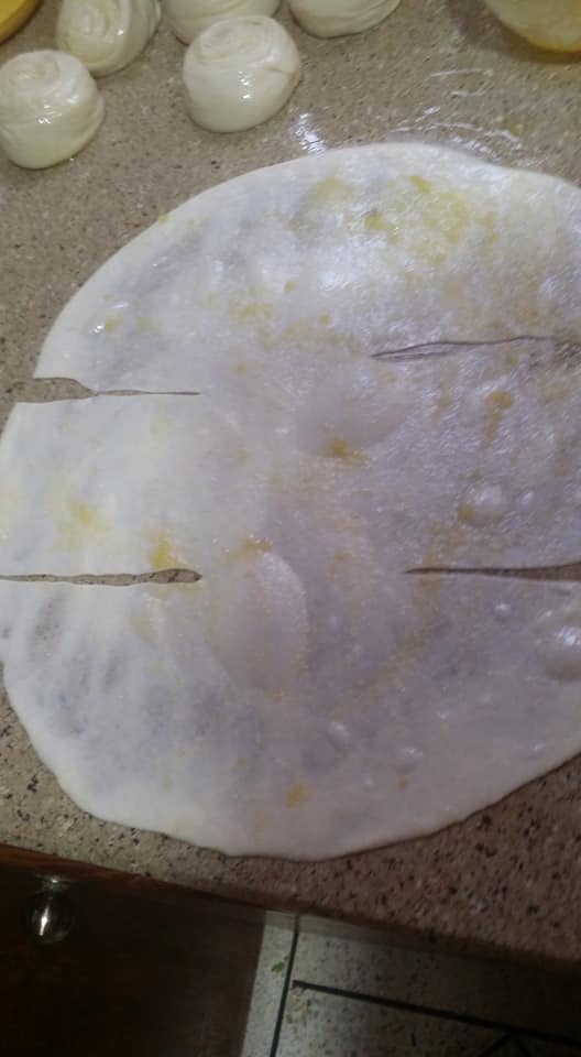 طبعا تبسط الفطائر بخليط الزبدة و الزيت و يرش بالسميد